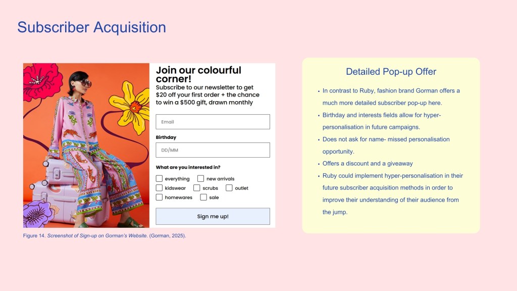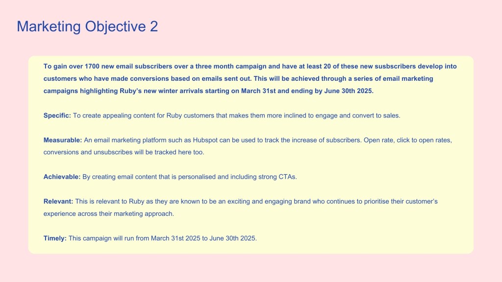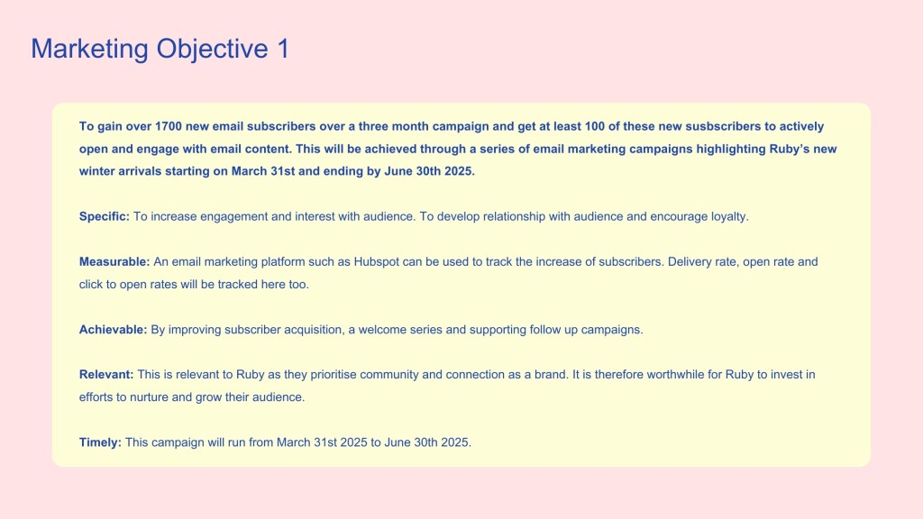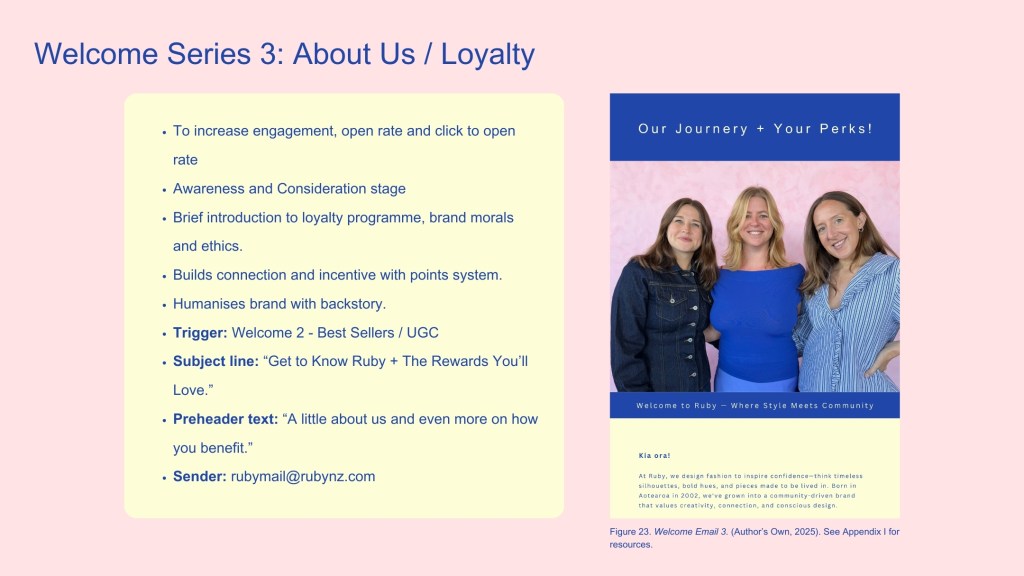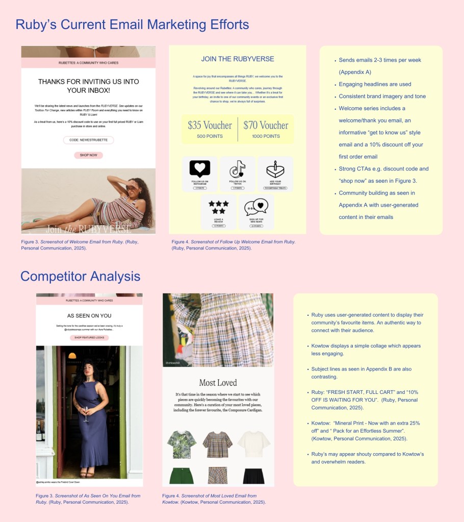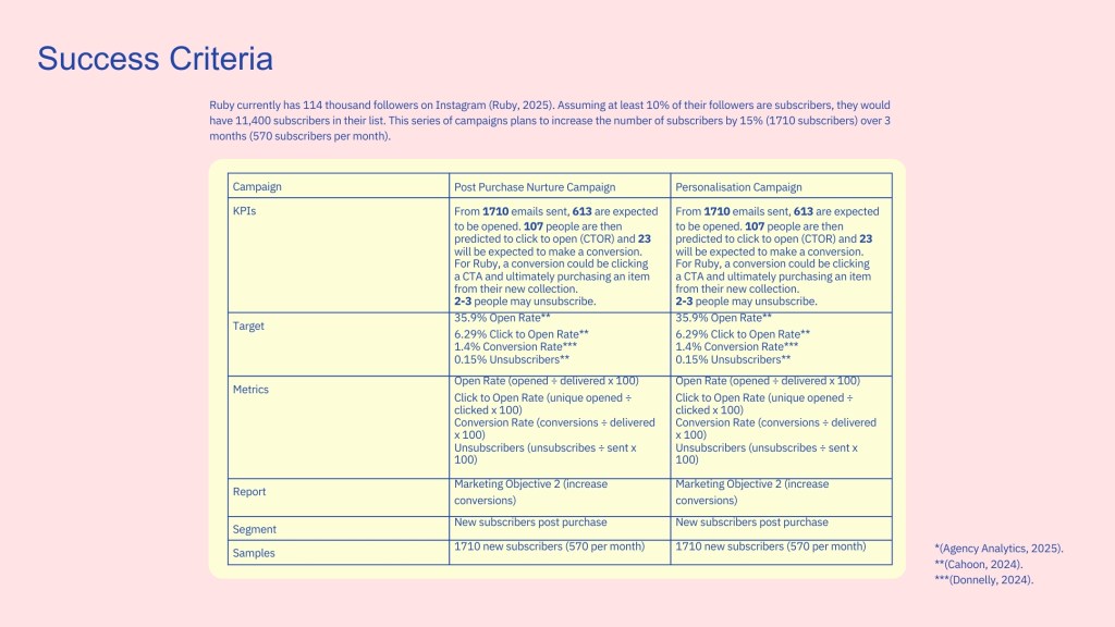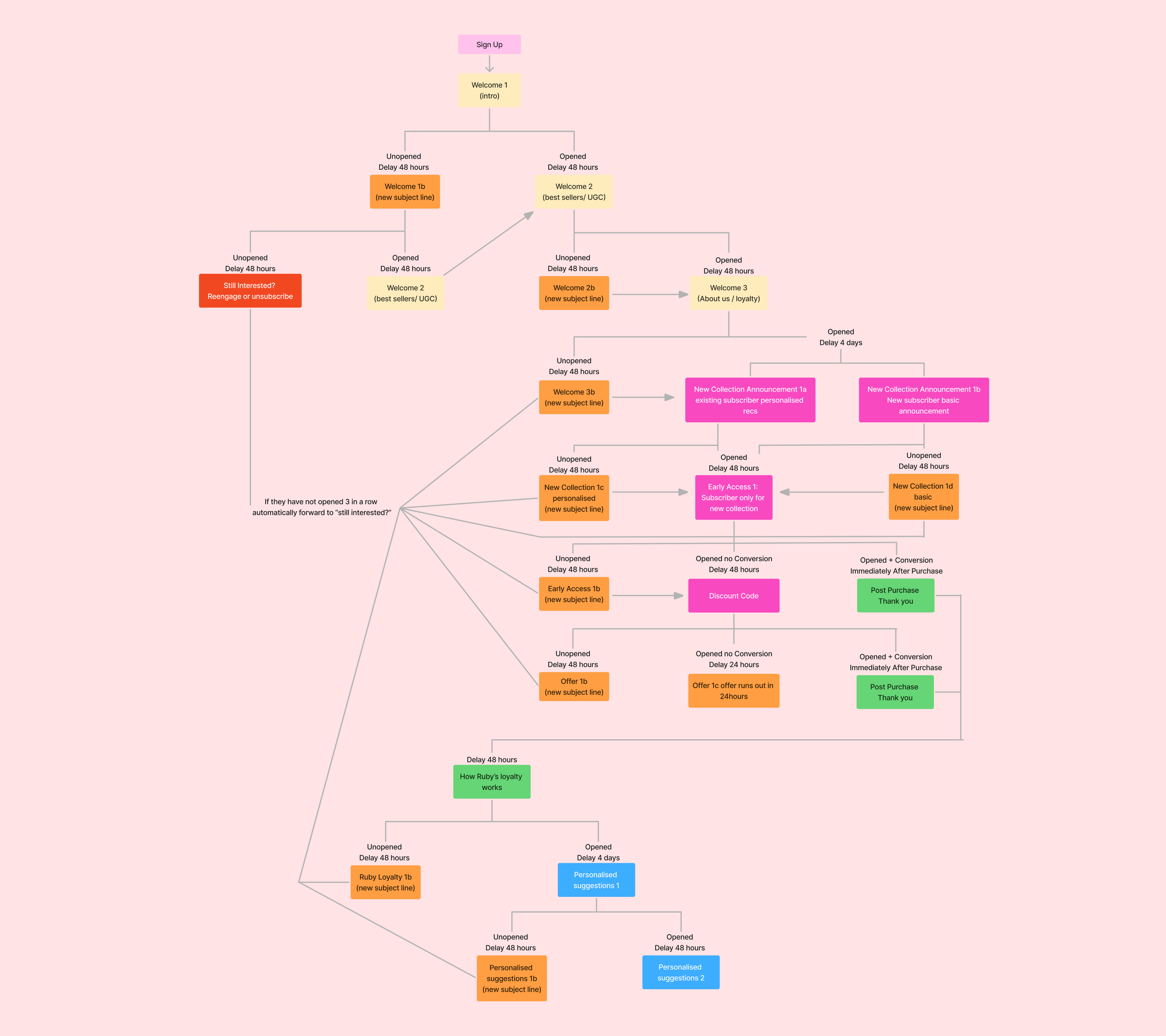An email marketing strategy for Ruby created during my Email Marketing paper at NZIE. After defining Ruby’s audience and setting campaign goals, this campaign focuses on developing a flowchart to represent a series of proposed emails for Ruby. This helps to streamline campaigns while also providing a personalised experience for Ruby subscribers based on where they are positioned in the buyer’s journey.