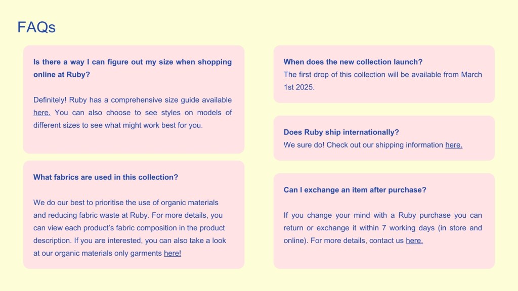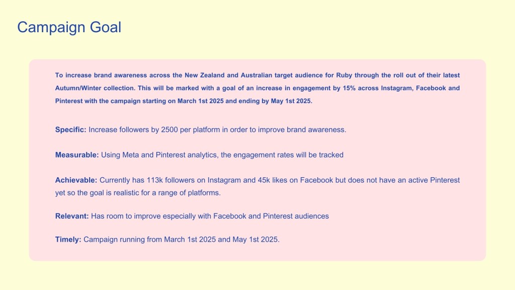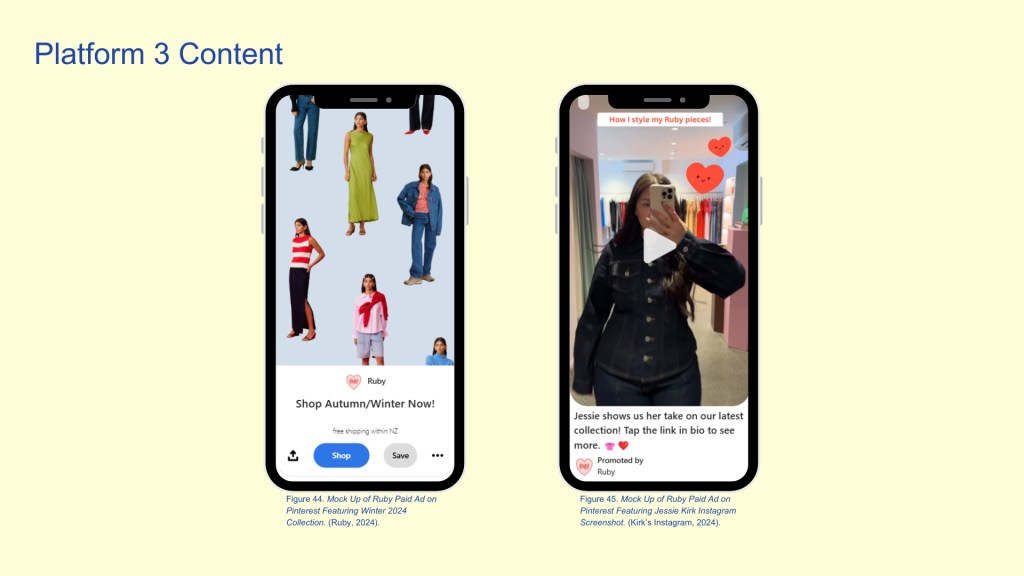 A social media campaign for my chosen brand Ruby created during my Social Media Marketing paper at NZIE. I started this project by completing extensive research on Ruby’s current positioning and defining their target audience. This then allowed me to create a proposed marketing campaign including organic and paid content and applying a range of engagement strategies across the relevant social media platforms.